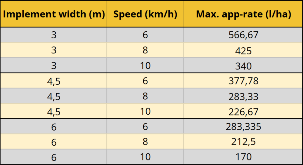 The application rate depends on the tractor speed and is regulated by a PWM controlled speed of the pump. Measurement of the tractor's speed is based on GPS datas. Regulation is highly responsive and precise.